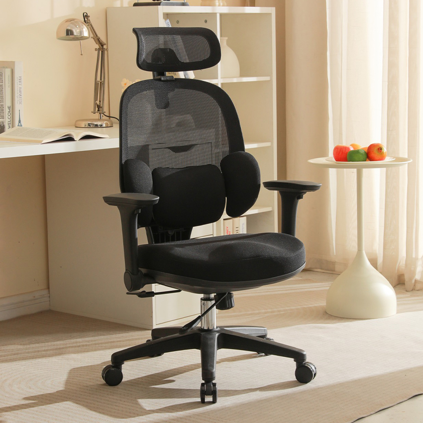 Phần tựa lưng được uốn cong tự nhiên, ôm sát cột sống, đi kèm đệm hỗ trợ thắt lưng có thể điều chỉnh. Nhờ đó, ghế giúp giảm áp lực lên vùng lưng dưới, hạn chế đau mỏi và hỗ trợ duy trì tư thế ngồi chuẩn suốt ngày dài.