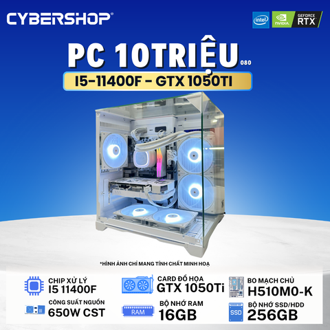 🔹CPU I5 11400F 6 nhân 12 luồng 🔹MAIN Asus H510 M0-K 🔹RAM 16GB 3200hz 🔹SSD 256GB 🔹VGA Gigabyte GTX 1050Ti 4Gb 🔹NGUỒN 650W 🔹CASE KÍNH CƯỜNG LỰC 🔹TẢN KHÍ KF400