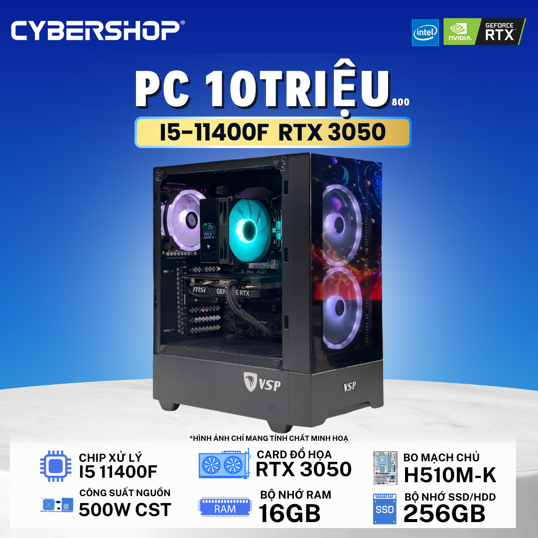 🔹CPU I5 11400F 6 nhân 12 luồng 🔹MAIN H510 M-K 🔹RAM 16GB (16GBx1) 3200MHZ 🔹SSD 256GB 🔹VGA Gigabyte RTX 3050 6Gb 🔹NGUỒN 500W 🔹CASE KÍNH CƯỜNG LỰC 🔹TẢN KHÍ A200