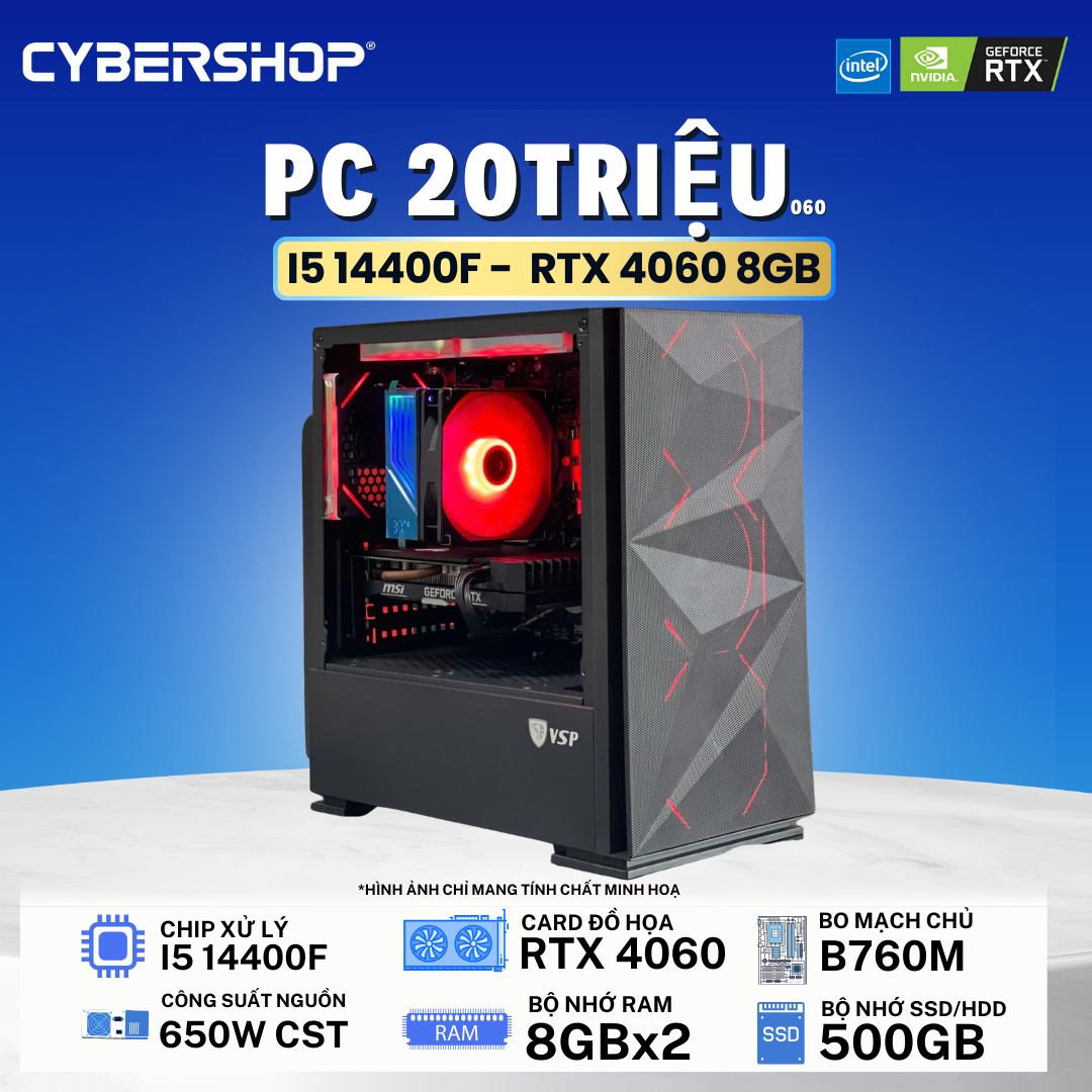🔹CPU I5 14400F 10 nhân 16 luồng tray new 🔹Mainboard MSI B760M Gaming Plus WiFi DDR4 🔹RAM 16GB (8GBx2) 3200MHZ 🔹VGA Asus Dual 4060 8GB 🔹NGUỒN MSI 650W 🔹SSD 500GB M2 MSI 🔹CASE BỂ CÁ + 5 FANLED SYNC 🔹TẢN NHIỆT KHÍ KF400